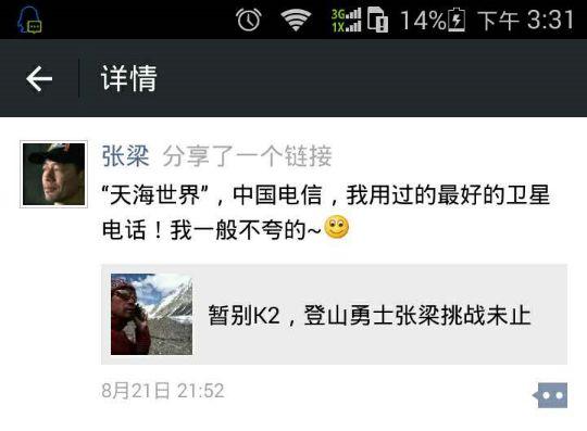 張梁一向?qū)踩旁诘谝晃唬腿ツ觌x頂峰僅有300多米的地方理智選擇后撤一樣;這一次,同樣為了安全和通信順暢的考慮,他帶上了天海世界提供的舒拉亞XT-LITE衛(wèi)星電話,前兩天還在六千多海拔的高峰上與我們進(jìn)行通話,愿我們的舒拉亞電話變成張梁的安全守護(hù)神,讓我們一起祝福他再次完成挑戰(zhàn),凱旋歸來。張梁,加油!