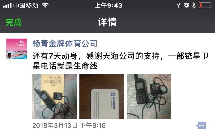 楊青將全程攜帶由天海世界提供的銥星衛(wèi)星電話作為安全保障